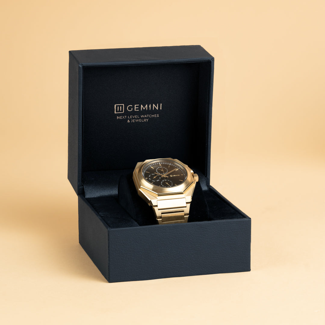 The name FERRO is derived from the Latin term ‘Ferrum’, which refers to ‘iron’. This watch series consists of models with a 316L stainless steel case and bracelet. The golden octagonal shape is combined with round elements to create a beautiful depth. This watch looks different from every perspective due to the dark accents.This beautiful watch is a feast for the eye due to its angular and round shapes.