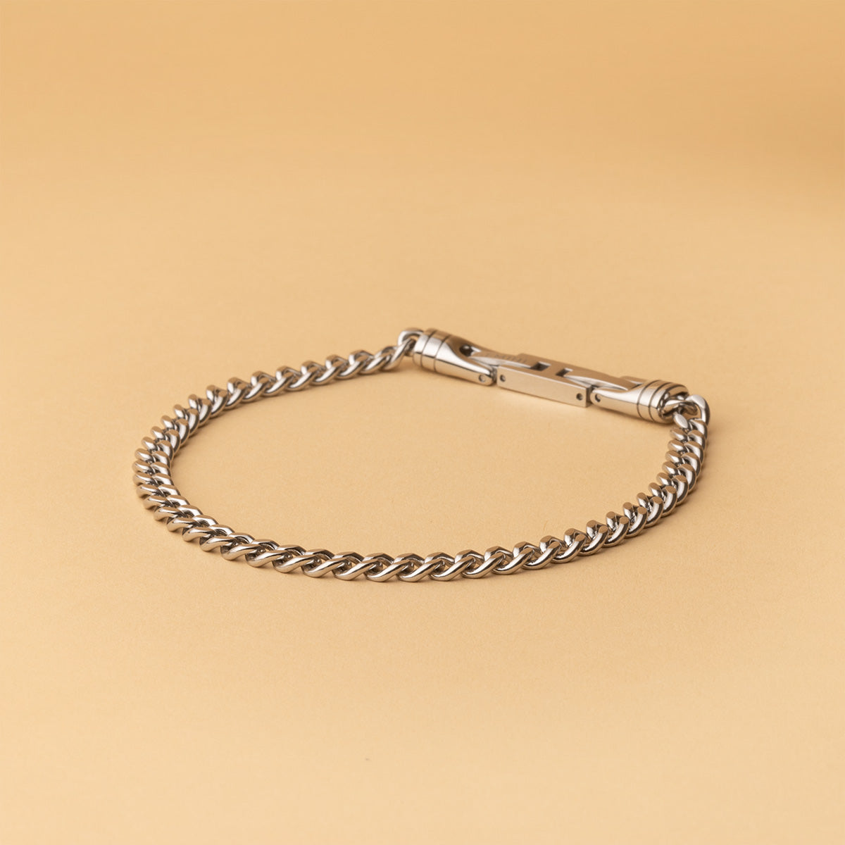 This beautiful 5mm cuban chain bracelet is made from 316L stainless steel. A cuban chain is a bracelet made from thick, interlocking oval links that are twisted to lie flat. Each link is rounded on the outside and flattened on the inside so the bracelet sits comfortably on the wrist. It’s one of the most iconic and recognizable chain styles in men’s jewelry.