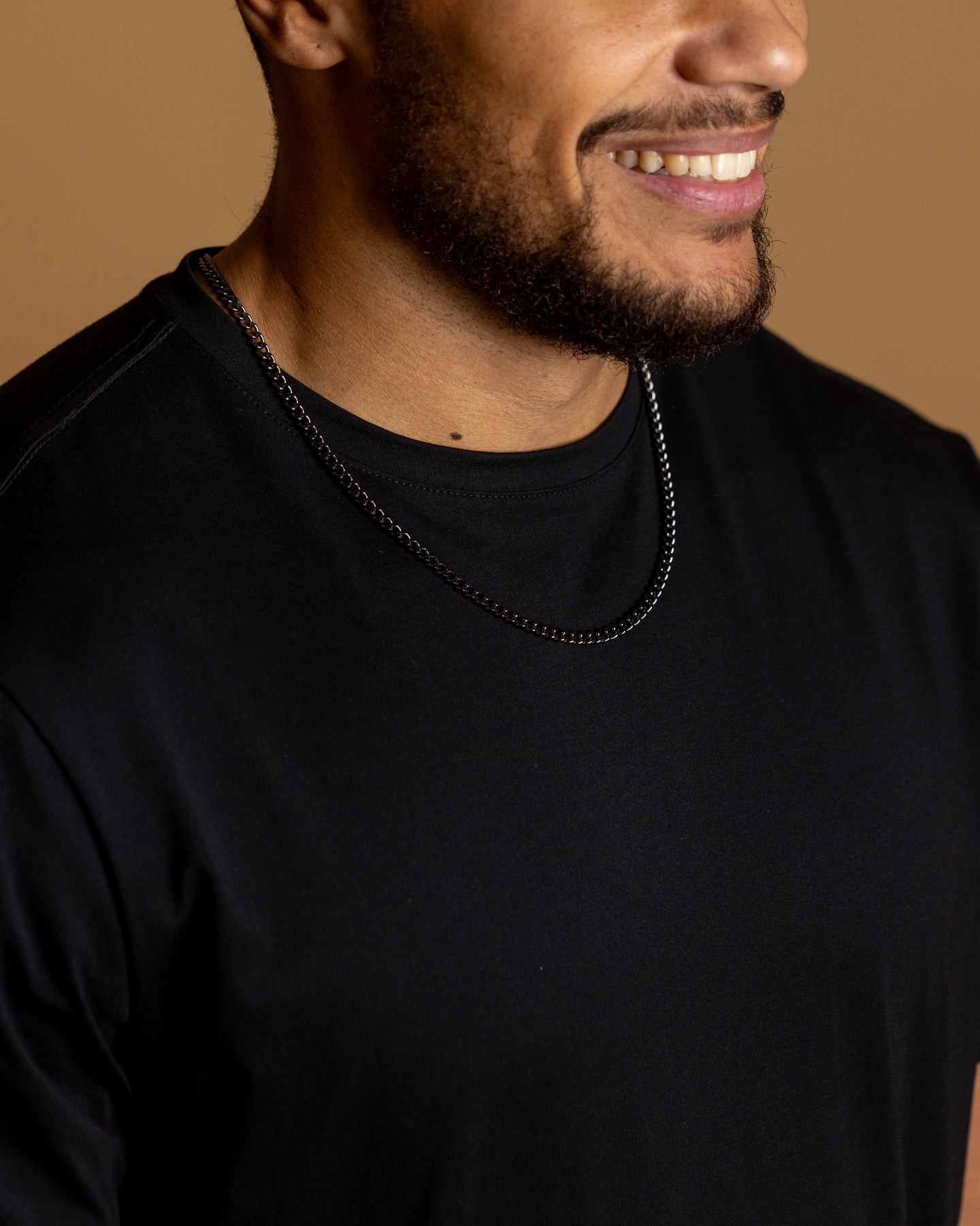 The Leno necklace is a 5mm cuban steel chain. cuban chain is made from thick, interlocking oval links that are twisted to lie flat. Each link is rounded on the outside and flattened on the inside so the necklace sits comfortably on your shoulders. It’s one of the most iconic and recognizable chain styles in men’s jewelry.