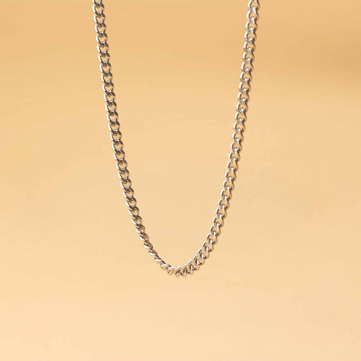 The Leno necklace is a 5mm cuban steel chain with a polished silver finish.