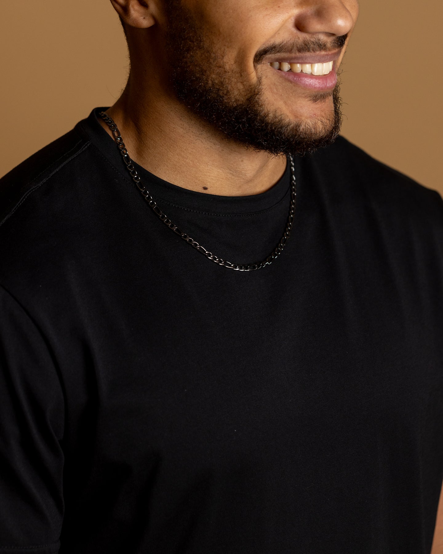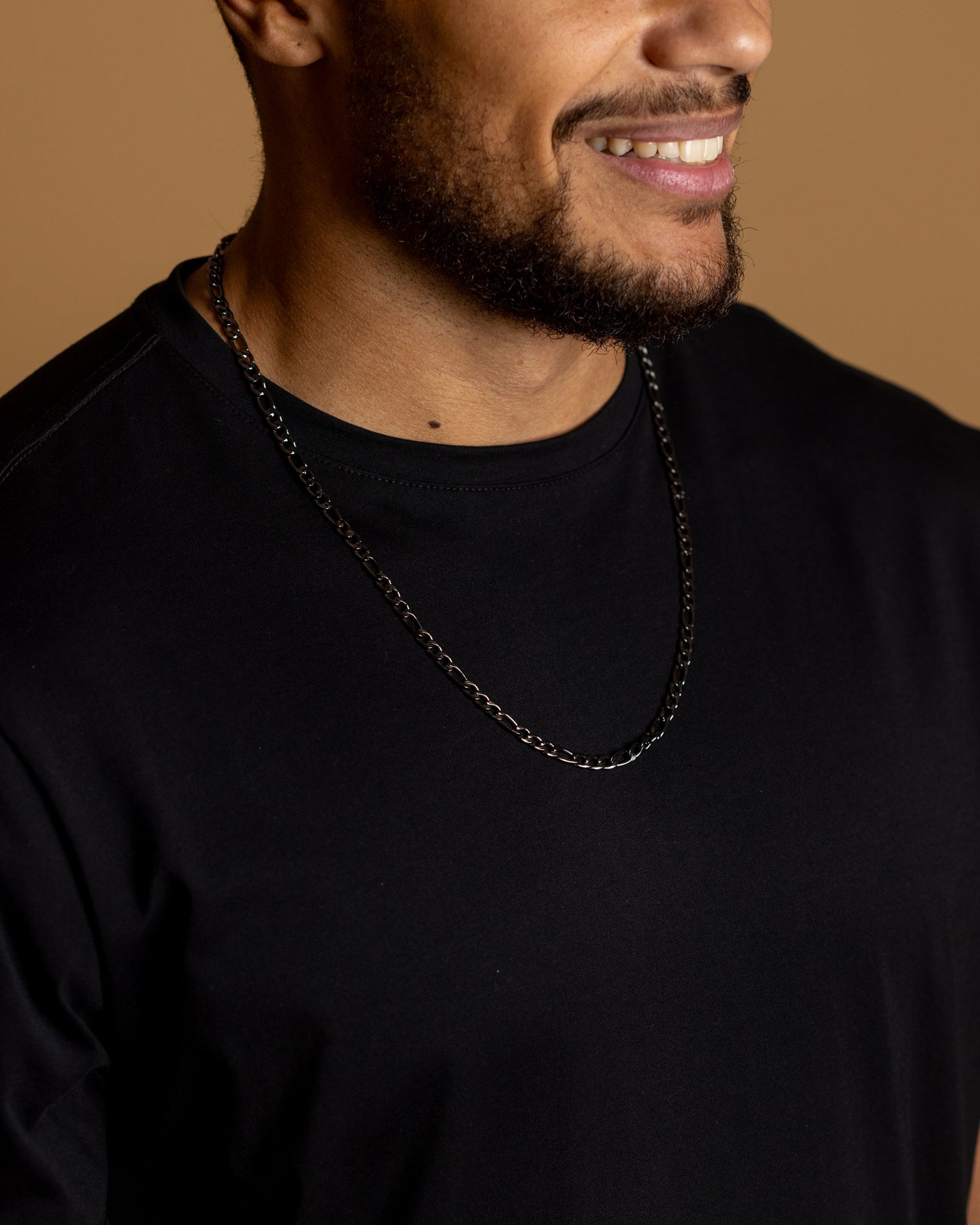 The Desino necklace is a 5mm figaro chain. It is made from 316L stainless steel and is very light and durable. You can wear this necklace day in, day out without any worries. The length of the chain is  54cm and it has a 10cm extension chain which you can add if needed.