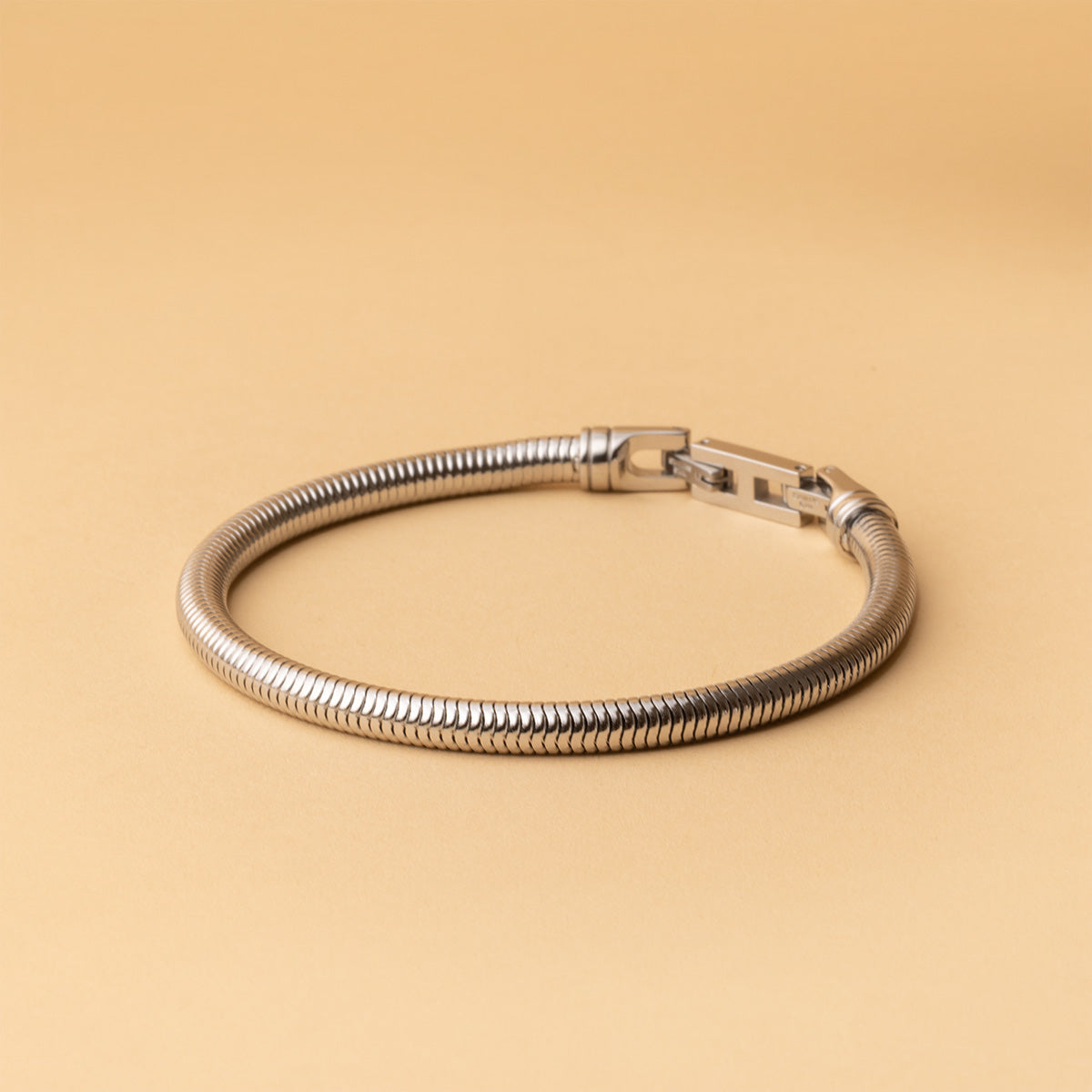 Snake chains were big in the 70s and early 80s for their sleek, futuristic look. Recent fashion waves brought them back—especially in stainless steel and men’s jewelry. It has enough presence to wear solo, but it also combines beautifully with bead bracelets or watches because the texture is calm and neutral.