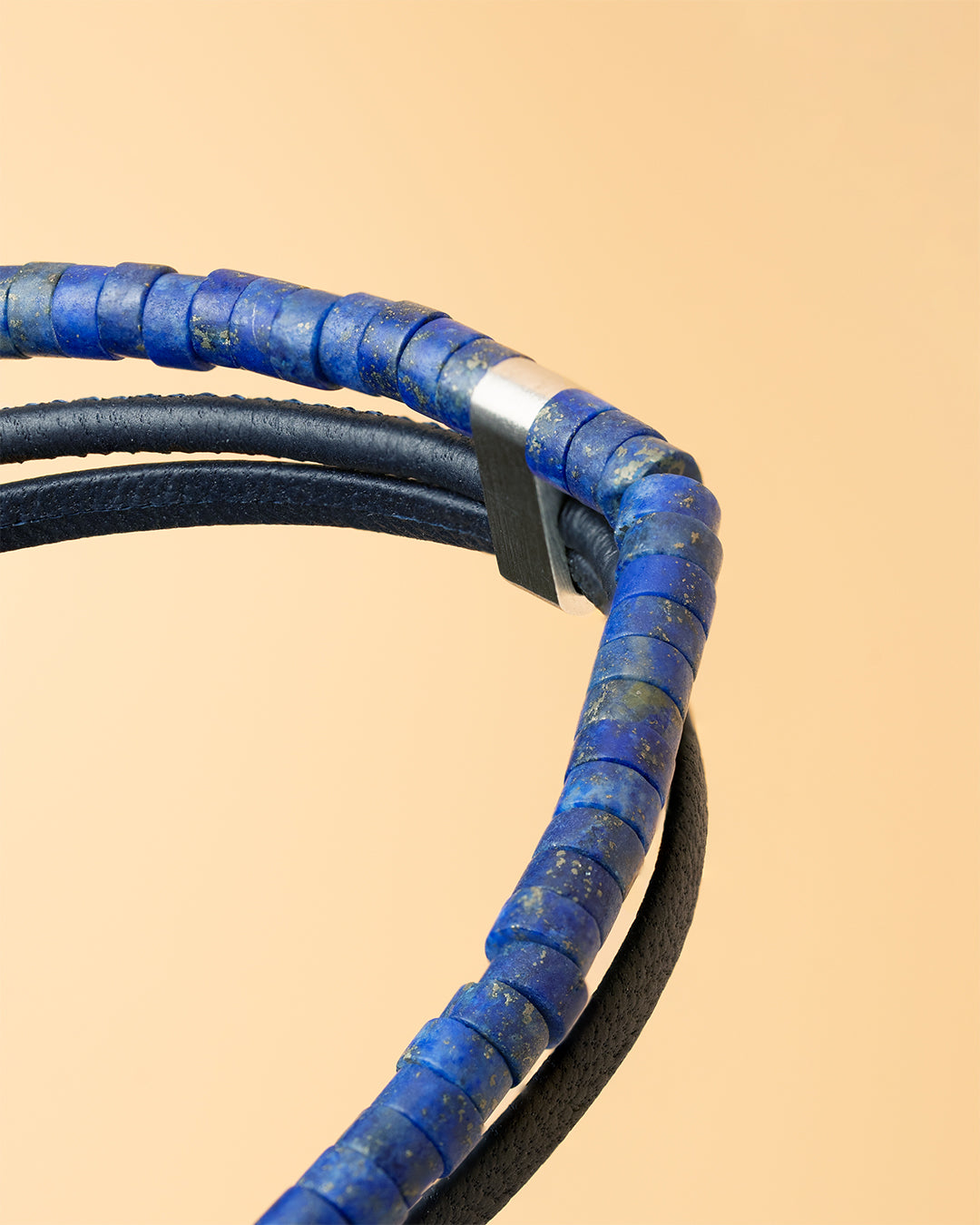 Bracelet triple avec cuir italien et pierre Lapis Lazuli de 2 mm