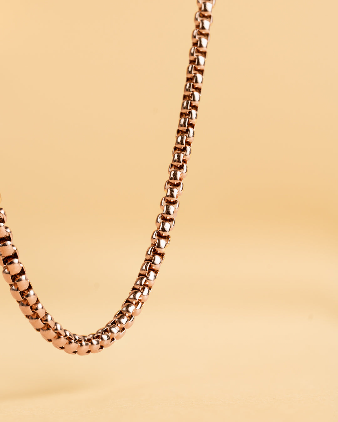 Het krijgt zijn naam omdat het ontwerp lijkt op kleine, rechthoekige schakels die op kleine doosjes lijken. De schakels zijn nauw met elkaar verbonden, waardoor de ketting een strak uiterlijk krijgt. Deze "doosachtige" structuur maakt de ketting sterk en duurzaam en daarom populair voor halskettingen.